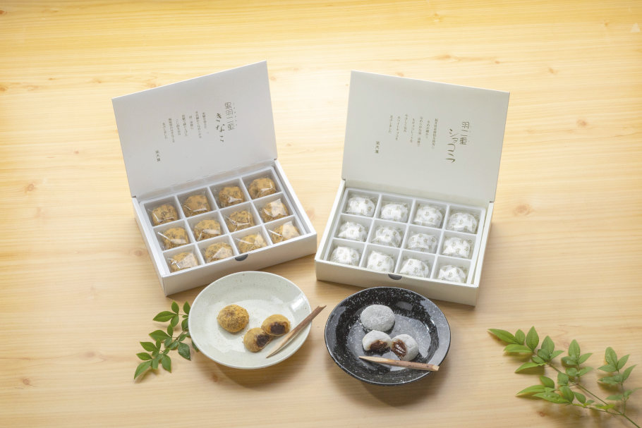 福井銘菓の筆頭に挙げられる羽二重餅は、県内の多くの店で多彩な商品が開発されています。創業大正12年の栄太楼では羽二重餅をアレンジしたお菓子のひとつとして、生チョコを包んでホワイトチョコで仕上げた「羽二重ショコラ」と、こしあんを包んできなこをまぶした「黒羽二重きなこ餅」を販売。長年の人気定番商品となっています。気軽につまめる一口サイズで女性やお子さま、年配の方も食べやすく、後を引くおいしさ。羽二重餅の材料や配合、自家製あんなども、和菓子屋ならではの上質な仕上がりです。