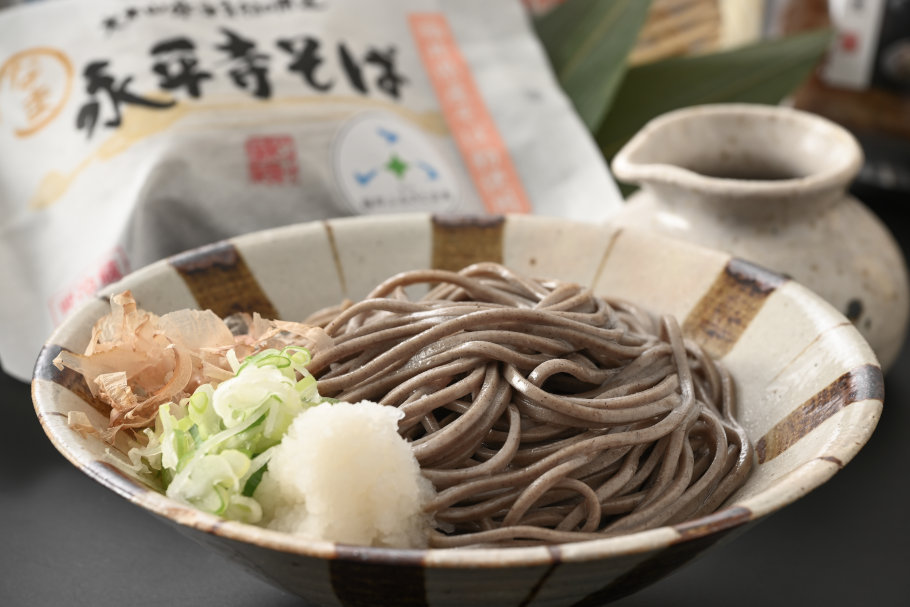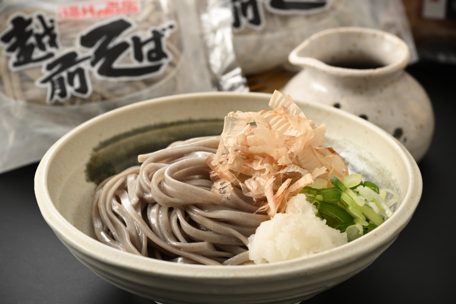ゆで上がった麺の姿から違いは明確。日福製麺の「越前そば」は黒みを帯びた田舎そば風の太麺で、ヤマサ製麺の「永平寺そば」は淡い茶色の繊細な細麺。大根おろしと専用のつゆをかけ、かつお削り節をトッピング。口に運ぶと、まず濃厚なかつおの旨味と大根の辛味が広がり、おろしそばらしさが弾けます。さらに「越前そば」は弾力のある力強いコシ、「永平寺そば」は心地よい歯ごたえがあり、どちらも噛みしめるほどに滋味深い味わいに。そば、つゆ、トッピングのすべてにこだわった完璧なおろしそばを、ぜひ食べ比べてみてくださいね。