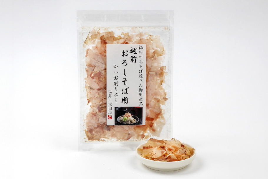 かつお節専門の老舗・太田屋が、おろしそばをよりおいしくする「かつお削り節」を開発。大根おろしと一体化したときの味や食感を吟味し、通常の花かつおに比べ、厚みを2倍強、幅を2分の1に削り、つゆを吸収しても固まりにくく、大根おろしに負けない強い風味の削り節に仕上げました。県内そば店でも好評の一品です。